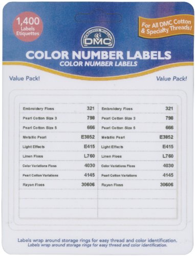 Set of pre printed self-stick fold over labels that can be adhered to the metal rings used for thread storage. Labels will identify DMC specialty threads by type and specific color number. Includes labels for all shades of DMC Embroidery Floss Pearl Cotton in size 3 and 5 Metallic Pearl Cotton Light Effects Linen Floss Color Variations Floss Pearl Cotton Variations and Rayon Floss. Pack contains over 1400 labels-including blanks. Especially designed for use with DMC's Needlework Organizing and Storage System.